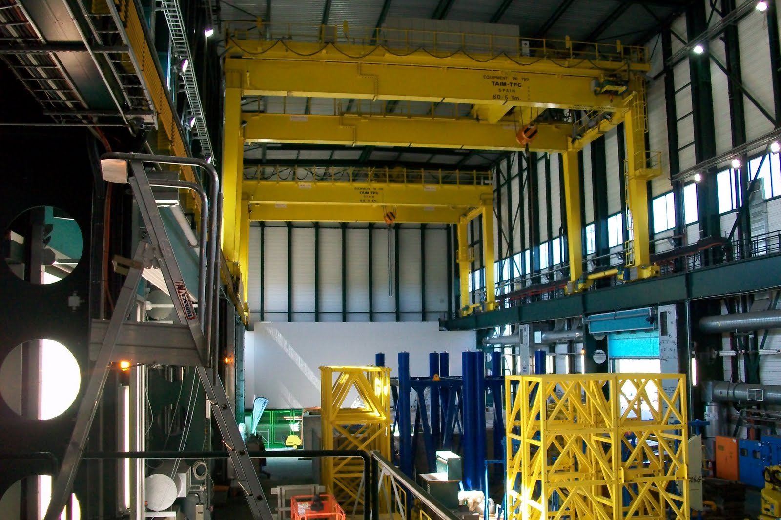 In this picture, you can see the large scale of the cranes and the building, which is roughly 5 stories high. It's currently used as a storage area. The blue scaffolding in the pictures is half the height of the detector. The scaffolding was used to access the beam pipe (made partly of beryllium) while inserting the pixel detector (designed and built at Nebraska).