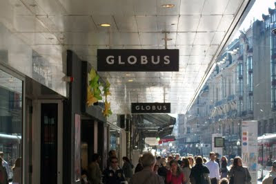 On the other side of the river, we walked along the shops. We saw a very oddly named shop, Globus. For those of you in the grid community will understand the humor: