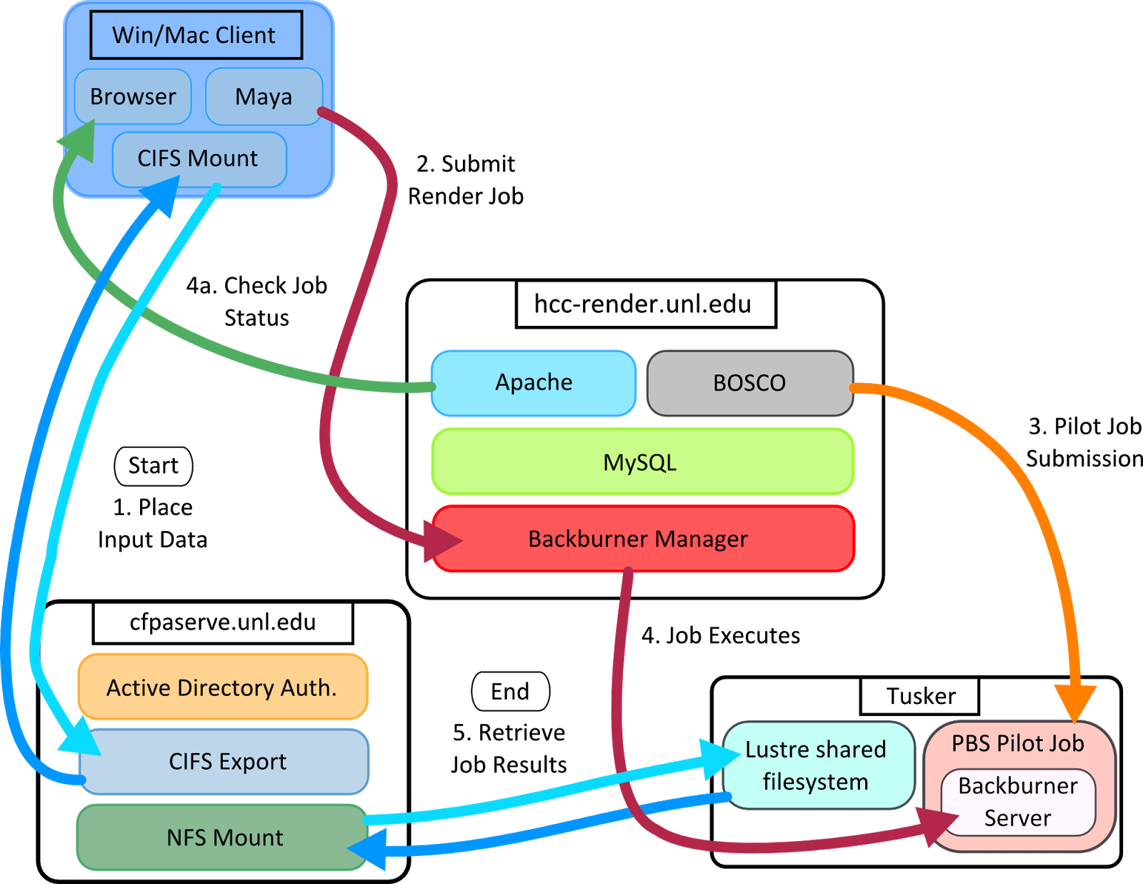 In the architecture shown in the image above, we run a central service, hcc-render that monitors the Backburner queue in order to submit the Backburner servers to the Bosco queue. Bosco then submits a glidein to Tusker, which in turn runs the Backburner server and renders the scene.